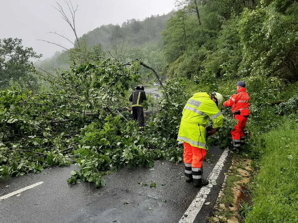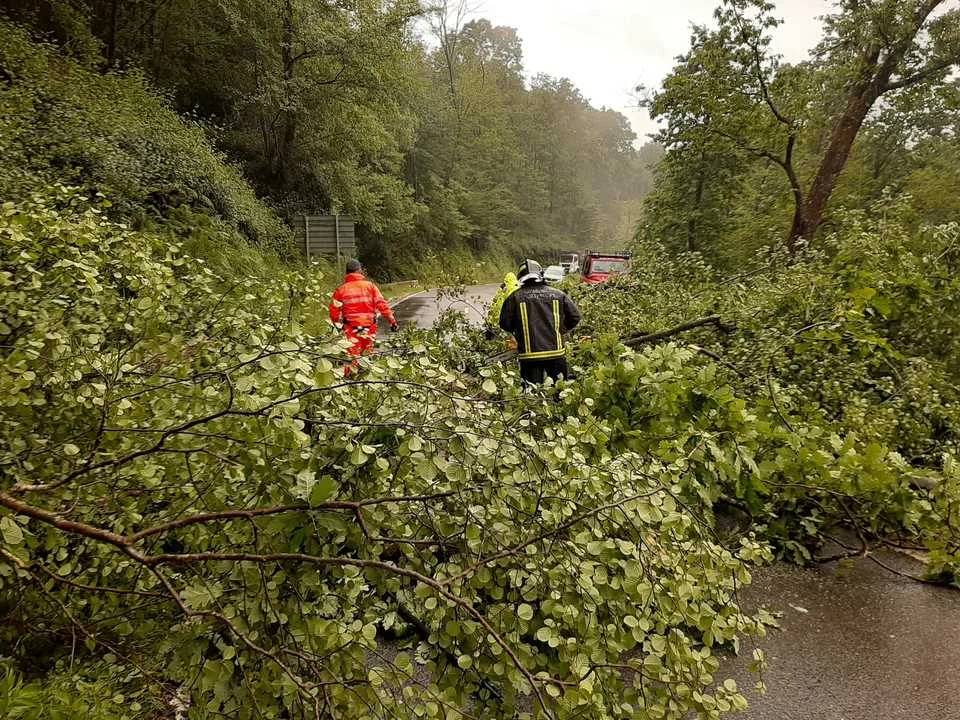 Goizuetako suhiltzaile boluntarioak errepidera eroritako arbolak kentzen.